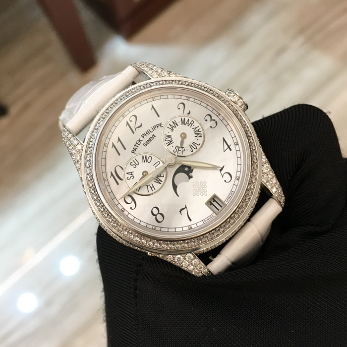 PATEK PHILIPPE 百达翡丽 复杂功能时计系列,4937G-001,表径37毫米,18K白金,表壳镶嵌431颗钻石(约2.79克拉),表冠镶嵌14颗钻石(约0.07克拉),表扣镶嵌27颗钻石(约0.2克拉)。白色巴厘岛珍珠母贝表盘。年历,指针式星期和月份显示,视窗式日期显示,月相显示,中心大秒针。蓝宝石水晶透盖。CAL.324 S QA LU 自动上弦机械机芯,动力储备35小时-45小时。专柜定价:511800元。