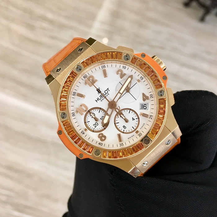 Hublot 宇舶 Bigbang 大爆炸系列,341.PO.2010.LR.1906。41毫米表径,18K玫瑰金表壳。白色面盘,日历显示、计时功能自动上弦机械机芯,动力储备42小时。专柜定价:288400元。