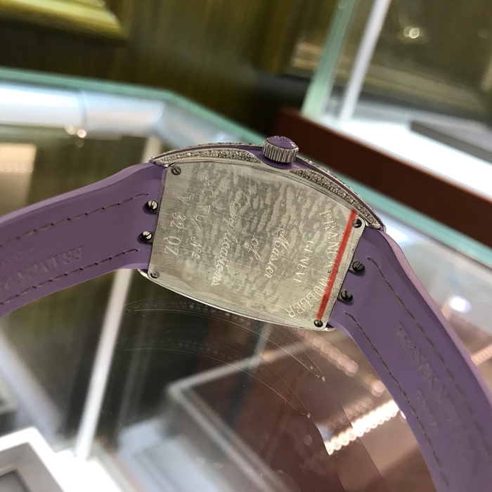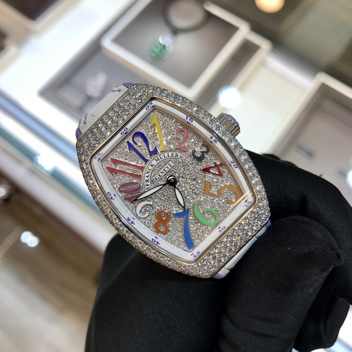FRANCK MULLER 法兰克穆勒 LADIES'COLLECTION系列,V 32 SC FO COL DRM。32*42.3毫米表径,精钢后加钻表壳,彩字满天星面盘。精准石英机芯。