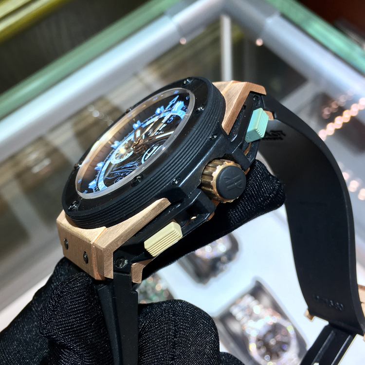 Hublot 宇舶 王者至尊系列,716.OM.1129.RX.DMA12。马拉多纳签名款。48毫米表径,18K玫瑰金表壳。黑色镂空表盘,日期显示,计时功能自动上弦机械机芯,动力储备42小时。专柜定价:285300元。