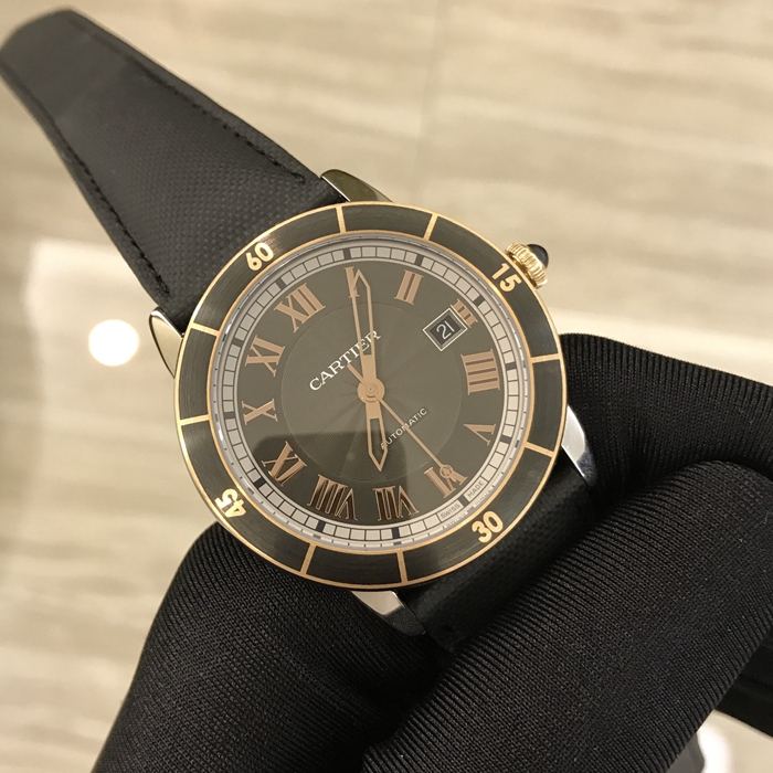 CARTIER 卡地亚 ROTONDE DE CARTIER系列,W2RN0005。42毫米表径,精钢/18K玫瑰金表壳,黑色面盘,罗马数字时标,3点位置视窗式日期显示。自动上弦机械机芯,动力储备42小时。