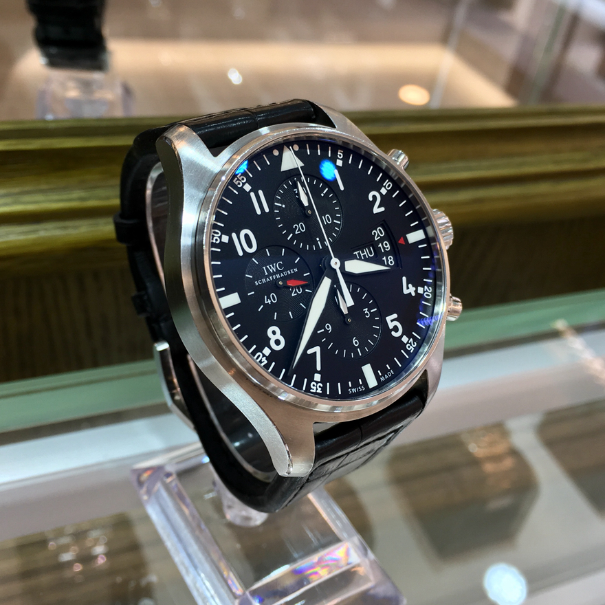 IWC 万国 飞行员系列,IW377701。43毫米表径,精钢表壳,黑色面盘,3点位置为星期、日期显示,计时功能,自动上弦机械机芯,动力储备44小时。专柜定价:41000元。