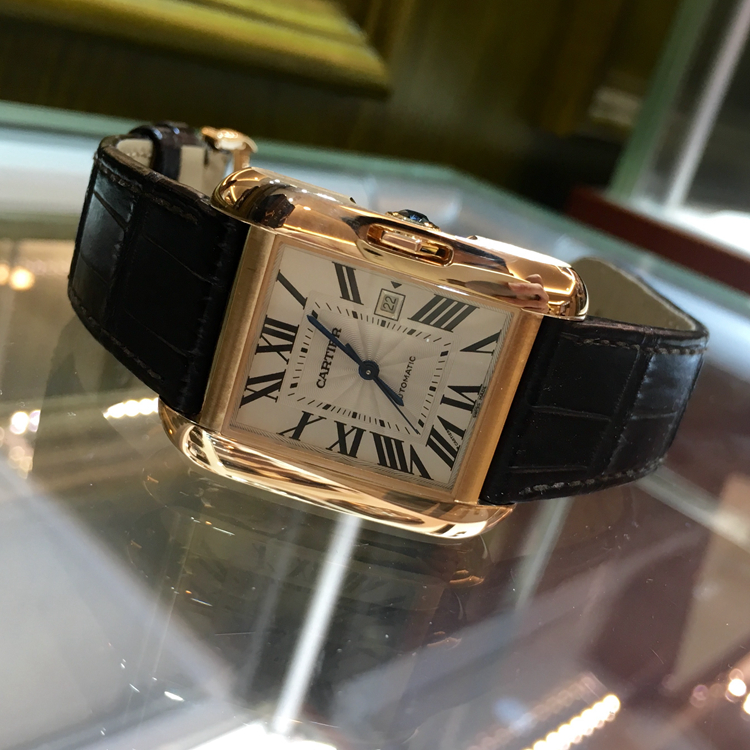 Cartier 卡地亚 Tank 坦克系列,W5310005。39.2 x 29.8毫米表径,18K玫瑰金表壳,镀银漆面扭索雕纹面盘,3点位置日期显示,九角形表冠,镶嵌一颗蓝宝石,Cal.077自动上弦机械机芯。专柜定价:116000元。