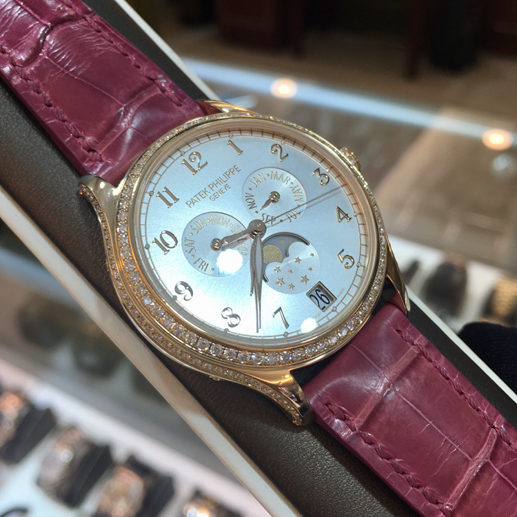 PATEK PHILIPPE 百达翡丽 复杂功能时计系列,4947R-001。38毫米表径,18K玫瑰金表壳镶嵌141颗钻石,约1.28克拉,表冠镶嵌14颗钻石,约0.06克拉,蓝色日辉纹或银色日辉纹表盘,金质立体字块,月相显示,视窗式日期显示,指针式星期和月份显示,中心大秒针。324 S QA LU自动上弦机械机芯,动力储备35-45小时,专柜定价:365200元。