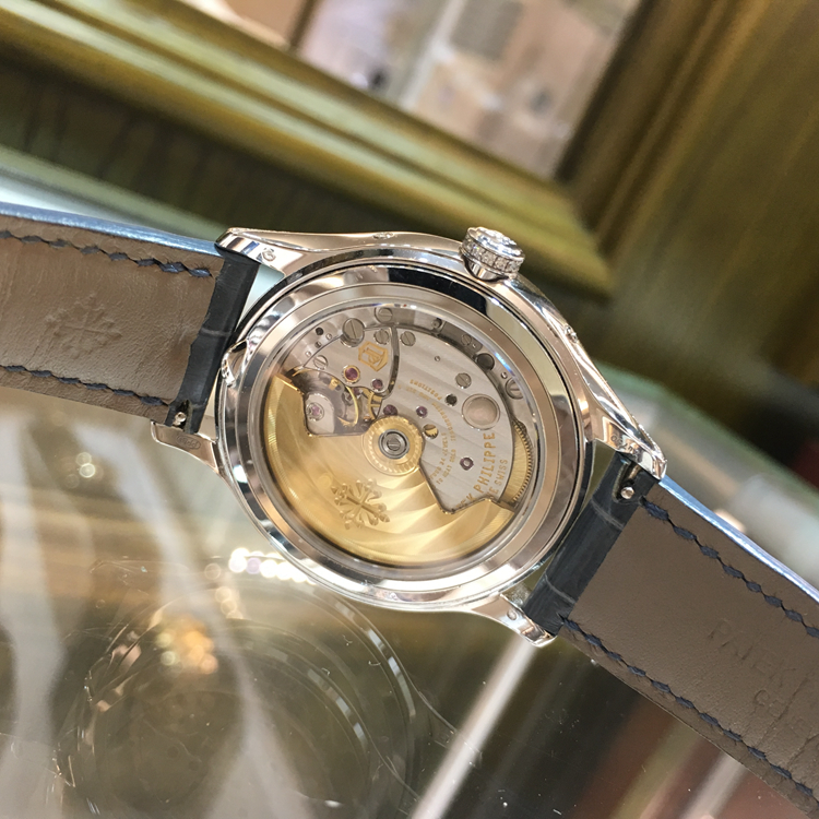 PATEK PHILIPPE 百达翡丽 复杂功能时计系列,4947G-001。38毫米表径,18K白金表壳镶嵌141颗钻石(约1.28克拉),蓝色日辉纹面盘,金质立体字块,中心大秒针,视窗式日期显示,月相显示,指针式星期和月份显示,324 S QA LU 自动上弦机械机芯,动力储备35-45小时。专柜定价:365200元。