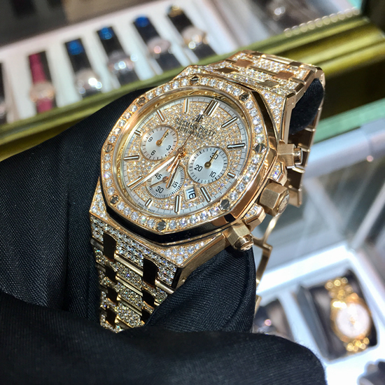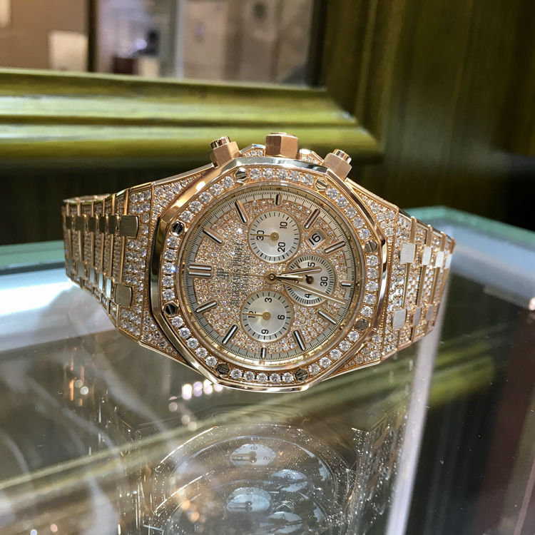 Audermars Piguet 爱彼 皇家橡树系列,26322OR.ZZ.1222OR.02。18k玫瑰金表壳原镶钻,表壳、表圈和表带镶嵌736颗明亮型切割美钻,总重约7.13克拉。41毫米表径,镶钻表盘搭配白色计时器副表盘,玫瑰金材质荧光立体时标和皇家橡树指针。18K玫瑰金镶钻表带搭配AP字样折叠表扣。Calibre 2385计时自动上链机械机芯,动力储备40小时。专柜定价1159000元。