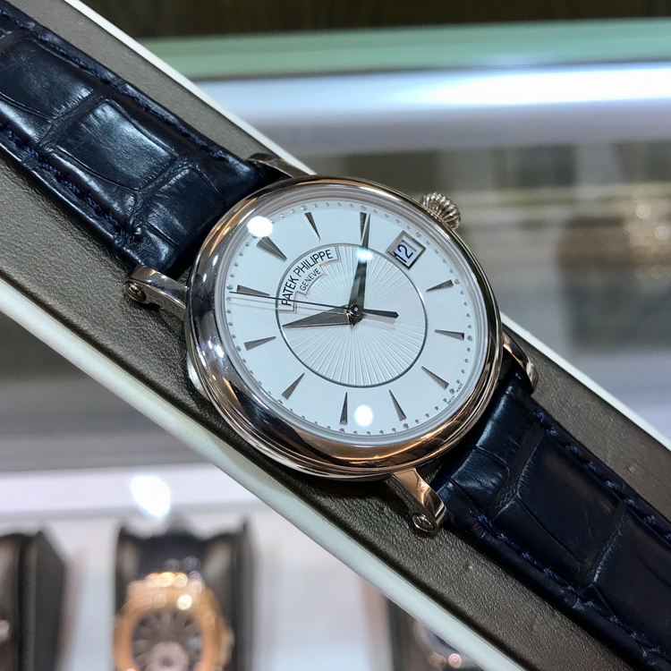 PATEK PHILIPPE 百达翡丽 Calatrava 古典表系列,5153G-010。38毫米表径,18K白金表壳,银白色面盘,中央饰有手工雕饰纹,金质立体时标,3242C自动上弦机械机芯,动力储备35-45小时。专柜定价:253200元。