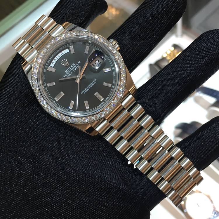 Rolex 劳力士 星期日历型系列,228349RBR。40毫米表径,18K白金镶钻表壳,黑色面盘,镶嵌钻石时标,中央时、分及秒针;快调瞬跳星期日历;秒针暂停功能以准确调校时间,3点位置为防反光凸透式放大日历窗,12点位置为星期显示,自产3255自动上弦机械机芯,专柜定价:430600元。