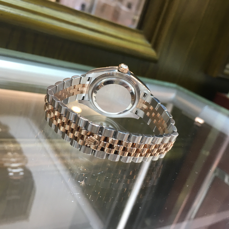 ROLEX 劳力士 女装日志型,279171。28毫米表径,18K玫瑰金/精钢表壳,三角坑纹外圈,紫色面盘,钻石时标,防反光凸透式放大日历窗,2236自动上弦机械机芯,动力储备55小时。专柜定价:83900元。