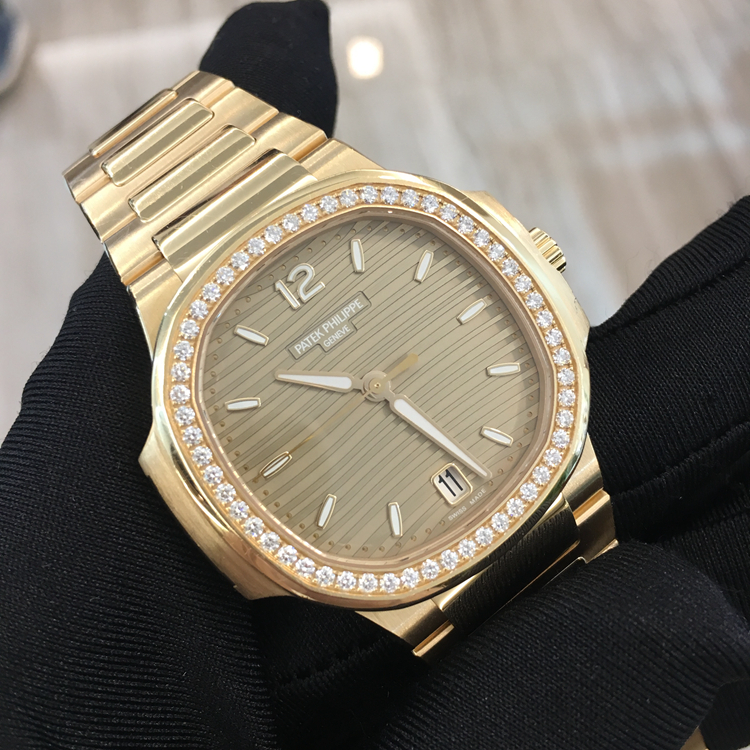 PATEK PHILIPPE 百达翡丽 NAUTILUS 运动系列,7118/1200R-010。35.2毫米表径,18K玫瑰金原钻表壳,表圈镶嵌56颗钻石(~0.67克拉),银色水平横纹浮雕图案表盘,覆荧光涂层的金质立体时标及字块,6点位置为日期显示,Cal.324 S C自动上弦机械机芯,动力储备45小时。