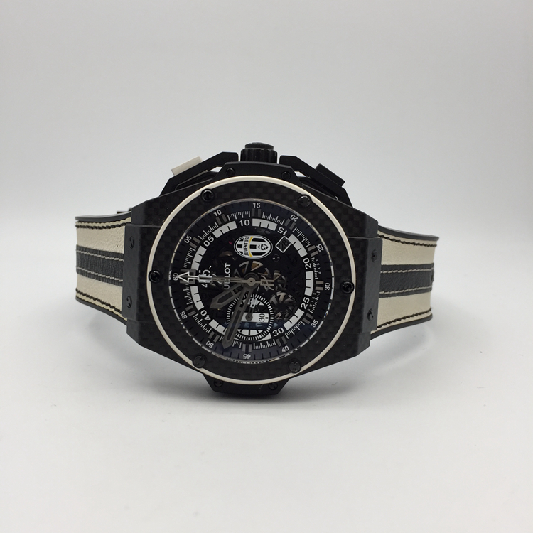 Hublot 宇舶 王者至尊系列,716.QX.1121.VR.JUV13。尤文图斯球队限量版,48毫米表径,黑白双色搭配锻造碳纤维材质,黑色面盘,日期显示功能,计时功能,自动上弦机械机芯,动力储备42小时。全球限量200枚 ,专柜价:184800元。