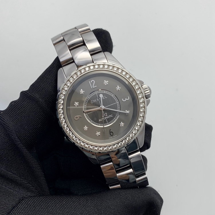 CHANEL 香奈儿 J12系列,H2566。38毫米表径,陶瓷表圈镶嵌54颗明亮式切割圆钻(约重1.4克拉)深灰色面盘,镶嵌8颗钻石时标 表盘细节装饰:中央垂直磨砂处理边缘饰以环形雕纹,自动上弦机械机芯。专柜定价:129200元。