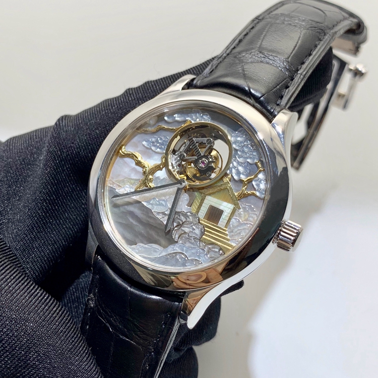 Van Cleef & Arpels梵克雅宝,全球限量一支Unique。42毫米表径,PT950铂金表壳,12点位置陀飞轮装置,天然珍珠贝母面盘,黄金雕立体瑞雪兆金屋图案。VCA独一无二高超立体镂雕工匠艺术,底盘透底陀飞轮机芯位置镶钻,凝聚VCA匠心艺术,专柜定价1855000元。
