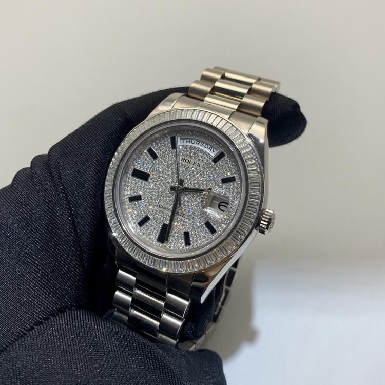 Rolex 劳力士 星期日历型系列,218399-83219。41毫米表径,18K白金原钻表壳,满天星面盘,3点位置日期显示,12点位置为星期显示,自动上弦机械机芯。专柜定价:922900元。
