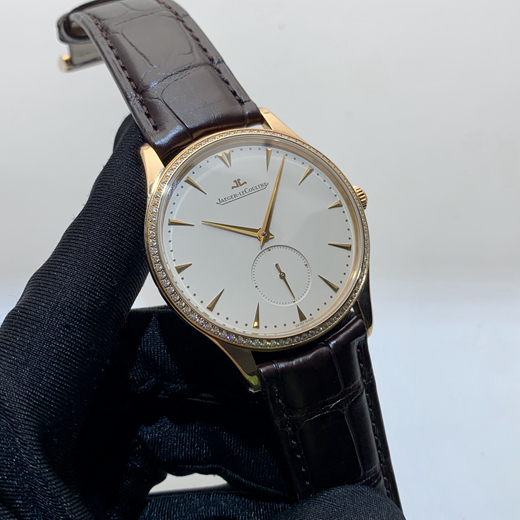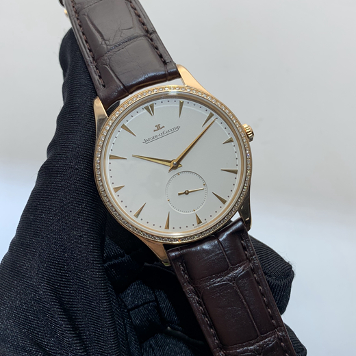 Jaeger-LeCoultre 积家 master 大师系列,1352502。40毫米表径,18k玫瑰金镶钻表壳,镶嵌84颗钻石约0.6 克拉,米色面盘,磨砂分钟刻度,镶贴时标,太妃形指针,896/1自动上弦机械机芯,动力储备43小时。专柜定价:149000元。