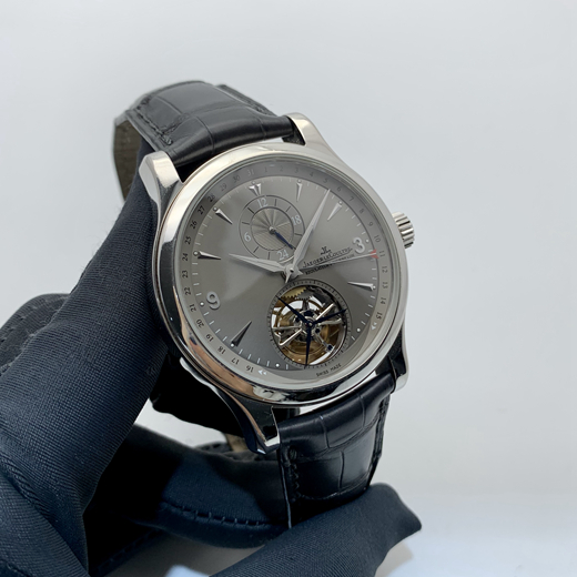 Jaeger-LeCoultre 积家 master 大师系列,Q1666520腕表。950铂金表壳,灰色镀铑,镀铑时标表盘,43毫米,表径。日期显示,双时区,陀飞轮功能。公价:835000元.