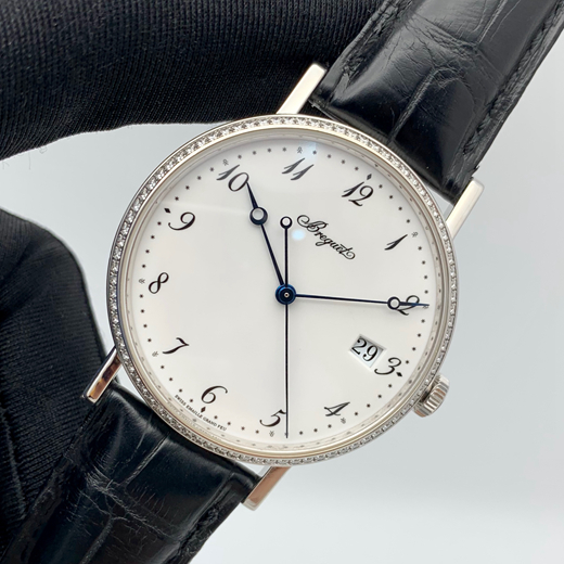 Breguet 宝玑 Classique 经典系列,5178BR/29/9V6/D000。38毫米表径,18K玫瑰金原镶钻圈,大明火白色珐琅表盘搭配蓝钢宝玑针,3点位置日期显示,自动上弦机械机芯。专柜定价:218500元。