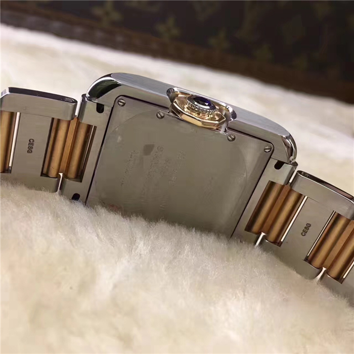 Cartier 卡地亚 Tank Anglaise 坦克 系列,W5310007。大号表款,39.2 x 29.8毫米表径,18K玫瑰金与精钢表壳,九角形表冠,镶嵌一颗尖晶石,镀银雕纹漆面表盘,罗马数字时标,剑形蓝钢指针,蓝宝石水晶镜面,18K玫瑰金与精钢表链,3时位置设日历显示窗。自动上链机械机芯。专柜定价73500元。