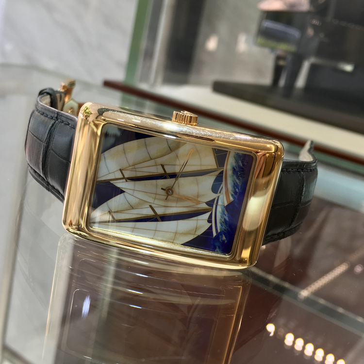 伯爵 黑带系列 G0A34071。30.6×46.3毫米表径,18k玫瑰金表壳,掐丝珐琅帆船面盘,自动上弦机械机芯,全球限量5只。