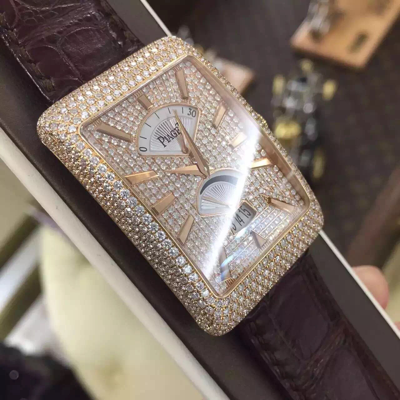 PIAGET 伯爵 黑带系列,G0A33060。31*46毫米表径,18k玫瑰金镶钻表壳,满钻面盘,六点位置日期显示、动力储备显示,飞返/逆跳功能,自动上弦机械机芯,动力储备41小时,专柜定价:822300元。