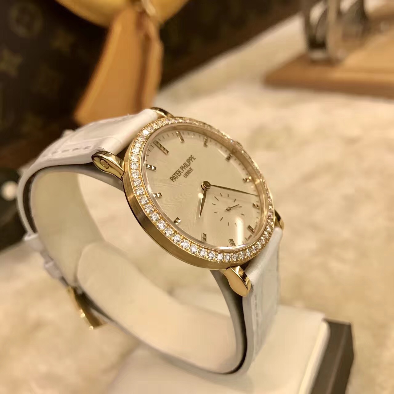 PATEK PHILIPPE 百达翡丽 古典表系列,7120R-001,31毫米玫瑰金原镶钻圈,背透手动机械,雕饰纹表盘,专柜定价228300.